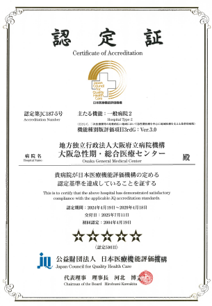 当センターは医療の質向上の取り組みとして、公益財団法人 日本医療機能評価機構による病院機能評価(3rdG:Ver.3.0)を受審し、『主たる機能:一般病院2』に2025年7月11日付で認定されました。