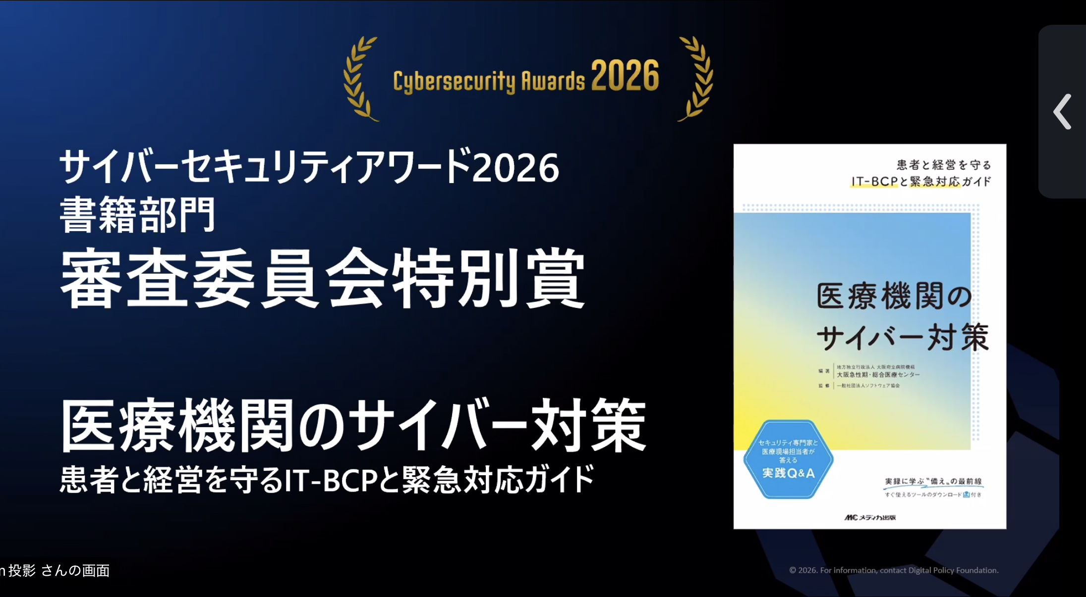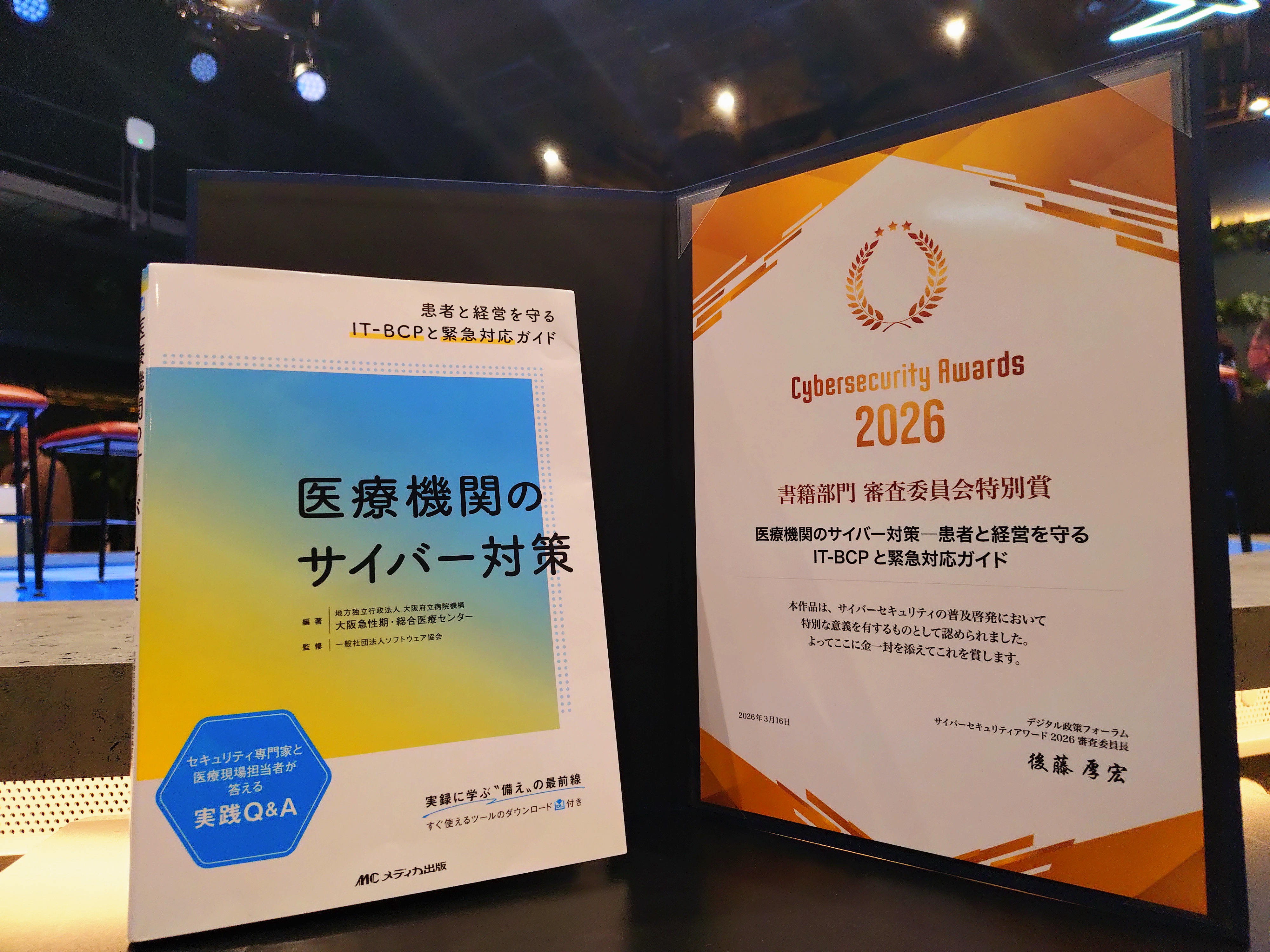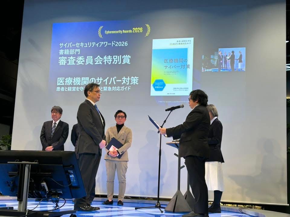 審査委員長講評では、当センターの本が大賞作品と遜色ない素晴らしい作品だったと、特別にコメントをいただきました。本書の刊行にあたり、ご協力・ご支援を賜りました関係者の皆様に、心より御礼申し上げます。本書が医療機関におけるサイバー対策の一助となれば幸いです。