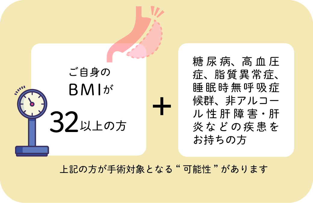 より健康で充実した人生を送るために、生活の質(QOL= qual ity of l ife)を低下させないために行われる手術です。 現在、 保険診療として認められている手術は、 胃の外側を切除して、細くする(スリ ーブ状にする)手術(腹腔鏡下スリーブ状胃切除術)です 。