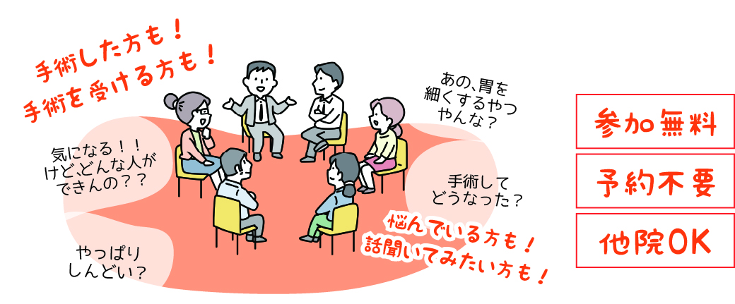 当センターではこれまで減量・代謝改善手術を40名以上の患者さんに行ってまいりましたが、 これらの患者さんから生の声を聞いてみることは、 とてもためになると思います。 患者会は、 受けた方、 受ける予定あるいは受けるかどうが悩んでいる患者さんがお互いの体験や知識を共有し、 健康的な生活習慣の実践を支えあう目的で開催されています。