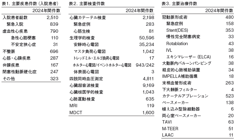 2024年の主要疾患件数(入院患者)、検査件数、治療件数を図1、表1〜3に示します。2024年の年間入院患者数は2,510人(緊急839人)で、その内訳は虚血性心疾患790人(急性冠症候群141人:そのうち急性心筋梗塞は110人)、不整脈696人、心筋・心膜疾患287人、下肢閉塞性動脈疾患247人、弁膜症167人、心不全377人、肺塞栓18人でした(図1)。コロナ感染症およびシステム障害の影響のため減少していた年間入院患者数はコロナ禍前に回復しつつあり、特に緊急入院患者は過去最多になっております。引き続き断らない循環器救急を目指しております。