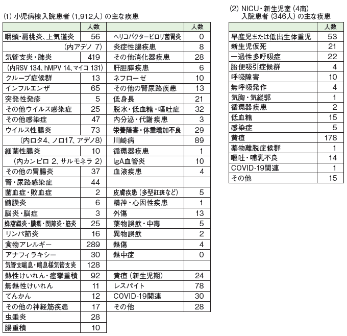(1) 感染症:一般的な感染症(気管支炎・肺炎、胃腸炎、尿路感染など)から重症感染症(髄膜炎、脳炎・脳症、重症肺炎、敗血症など)まですべての感染症