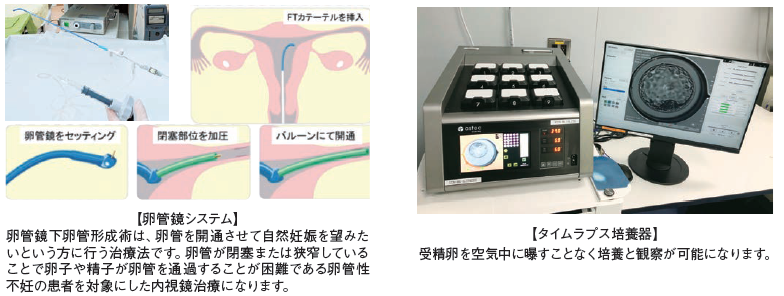 診療内容については、一般的な不妊検査及びタイミング治療から人工授精・体外受精まで幅広い不妊治療を実施しています。2022年度からは卵管閉塞に対する卵管鏡下卵管形成術、胚のタイムラプス培養を導入し、より不妊治療の成功率の向上に取り組んでいます。