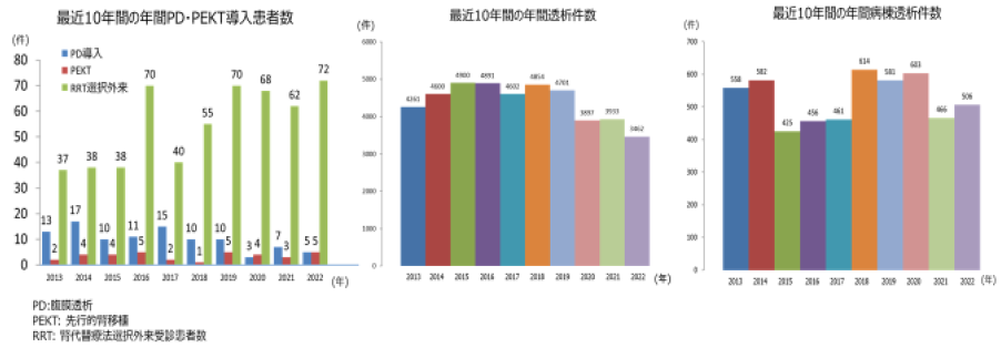 わが国における透析導入患者数ならびに維持透析患者数は未だ増加の一途であり、日本透析医学会の調査では、2021年末の時点で約35万人が維持透析を受けています。また、わが国では、腹膜透析ならびに腎移植の患者数が極端に少ない (選択率が低い)ことが特徴であり、腎代替慮法選択説明が十分に実施されていないことが問題となっています。