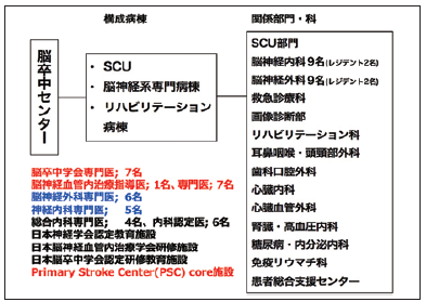 当センターは、脳神経内科、脳神経外科を中心に画像診断部、救急診療科、心臓内科、心臓血管外科、リハビリテーション科、耳鼻咽喉・頭頸部外科や看護部、患者総合支援センターなどの多部門が連携し、超急性期から回復期までシームレスな脳卒中診療を担い(図1, 2)、脳神経系の専門医が24時間常駐して脳卒中集中治療室(Stroke Care Unit:SCU12床)において緊急症例を受け入れ、専門的治療、看護、急性期リハビリテーションを行っています。